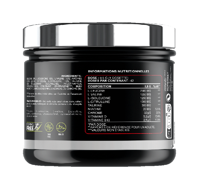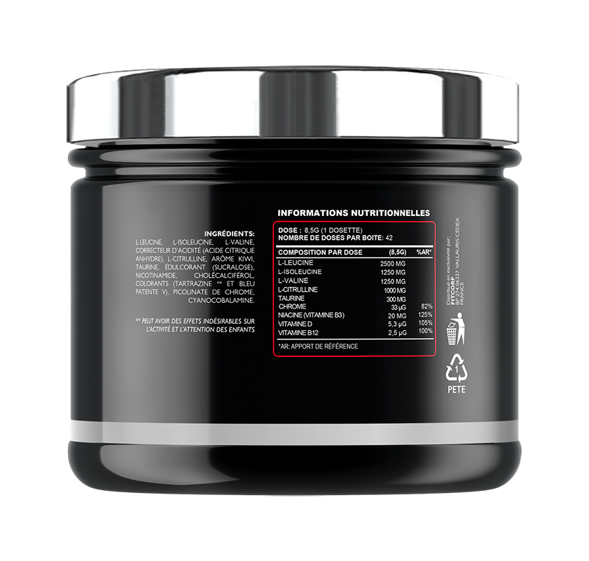 Les BCAA interviennent lors de la synthèse protéique et réduisent la dégradation musculaire, ils sont considérés comme les acides aminés les plus importants en musculation. Ils participent non seulement à la restauration de la masse musculaire mais, associés aux 9 actifs de la formule, ils interviennent dans l’augmentation de la force musculaire et dans l’apparition du fameux effet « pump ».