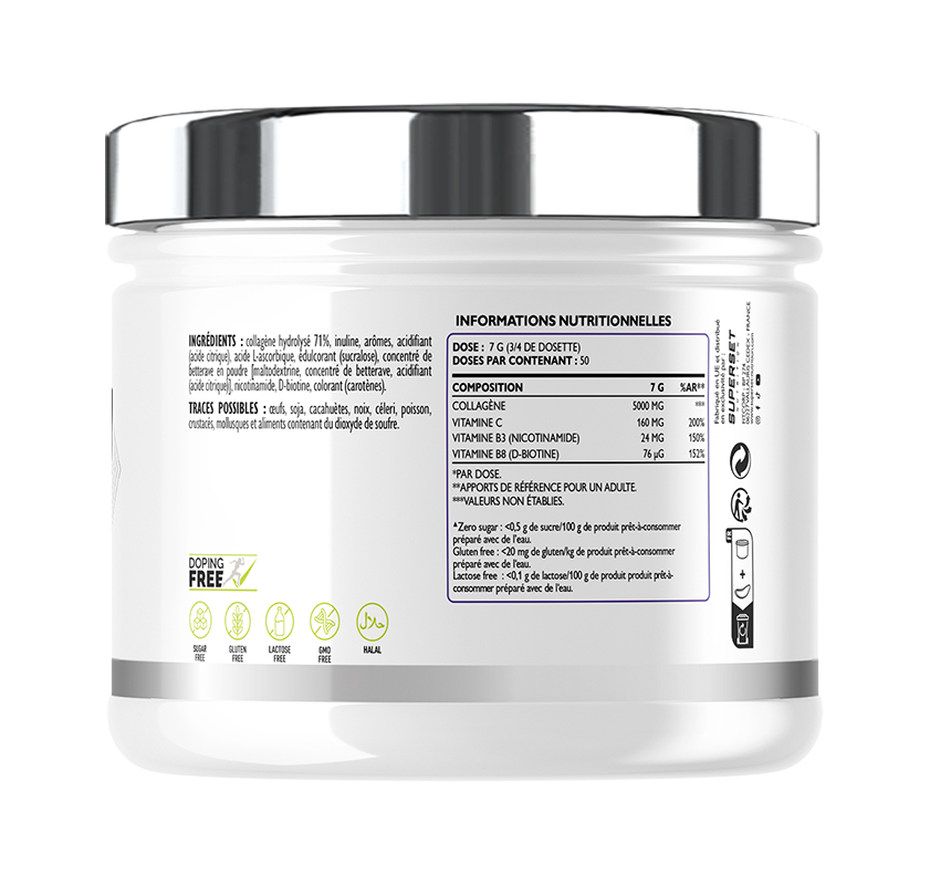 Composé de 71% de collagène hydrolysé de type II Peptan®, nos coachs et experts en nutrition ont choisi cette forme de collagène car elle est presque entièrement assimilée par l’organisme pour une efficacité supérieure.