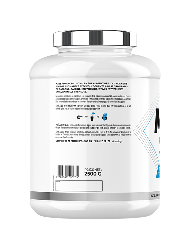 Mass Advanced (2,5 kg) est une formule de prise de masse performante pour favoriser considérablement la masse musculaire. Ce gainer est spécialement conçu pour ceux qui n’arrivent pas à prendre du poids, de morphotype ectomorphe ou avec un physique sec.