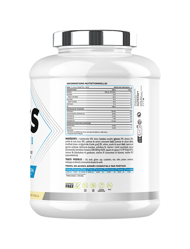 Maltodextrine 34%, farine d’avoine complète (gluten) 24%, dextrose 20%, amidon de maïs cireux 10%, caséinate de calcium instantanée (lait) [caséinate de calcium (lait), émulsifiant (mono- et diglycérides d’acides gras)] 8%, arômes, poudre de yaourt (lait), épaississant (gomme xanthane), édulcorants (sucralose, acésulfame K), vitamine C (acide L-ascorbique), niacine (nicotinamide), bromélaïne d’ananas (1200 GDU/g) 0,02%, papaïne de papaye (1,5 FIP U/mg) 0,02%, vitamine B6 (chlorhydrate de pyridoxine), vitamine B1 (mononitrate de thiamine), vitamine B12 (cyanocobalamine).